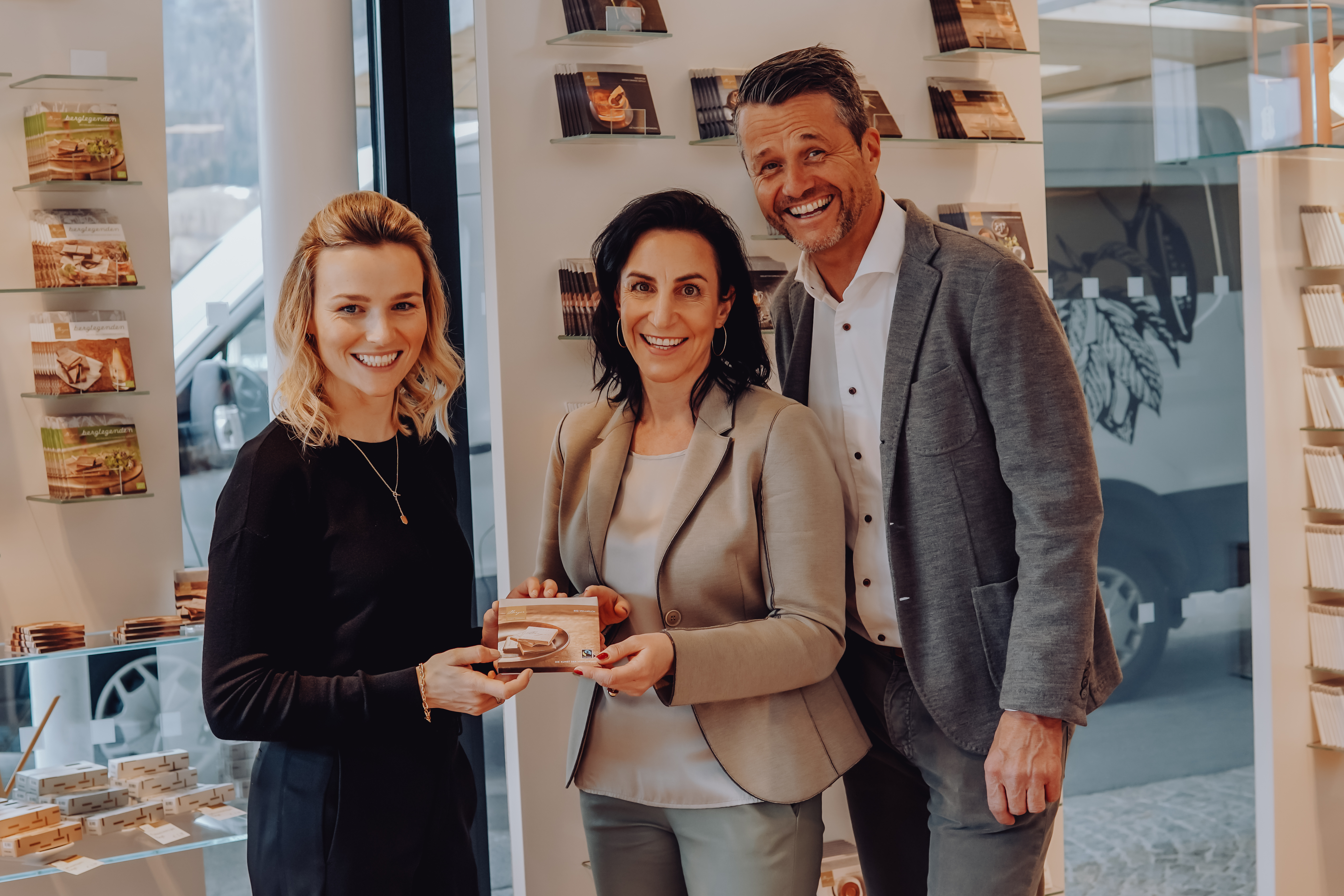 „Einer dieser ganz besonderen Momente, die ich erleben durfte, war beim Abschwingen im Ziel der Ski-WM in Schladming 2013. Mein Blick ging hoch auf die Tribüne und ich sah, dass ein großer Teil der Tribüne goldfarben war. Und das nicht, weil ich gewonnen habe, sondern weil die Belegschaft von Berger Feinste Confiserie zum WM-Slalom gereist ist und in Handarbeit goldene Mützen gestrickt hat.“, erzählt Bernadette. Und auch noch heute können sich viele an den einzigartigen goldenen Helm mit Kakaobohne erinnern.